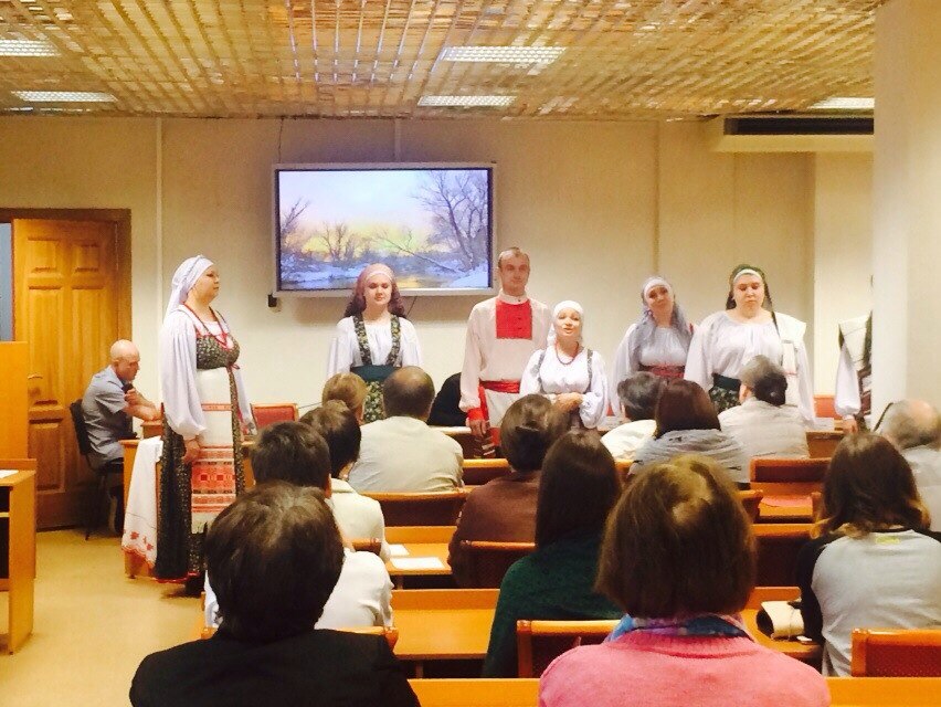 От теории к практике перешла гостья из академии им. Гнесиных, рассказав о духовных основах русской песни, и дала несколько мастер-классов по восьмиголосному пению.