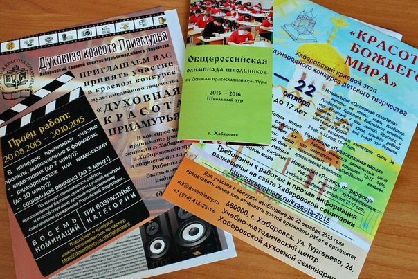 Впервые в этом году Хабаровская духовная семинария открыла мультимедийный конкурс «Духовная Красота Приамурья». Стартовал конкурс с 20 августа и продлится до 30 октября 2015 г. На настоящий момент уже представлены работы с общеобразовательных школ г.Хабаровска и г. Комсомольска-на Амуре. Рассказывая о новом конкурсе организатор конкурса обратила внимание, что также к участию конкурса принимаются работы выполненные в качестве слайд-шоу в программе Power-point.