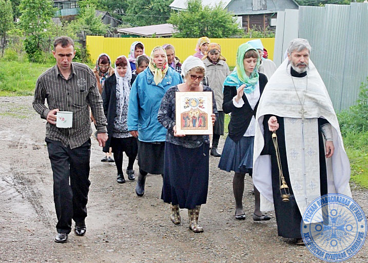 Затем все пришедшие на престольный праздник во главе с отцом Владимиром обошли храм крестным ходом, с многократным пением тропаря и кондака праздника. Молящиеся с сердечной радостью и воодушевлением подпевали хору. После окропления прихожан святой водой было сделано общее фото в память о миссионерском посещении прихода отцом Владимиром.