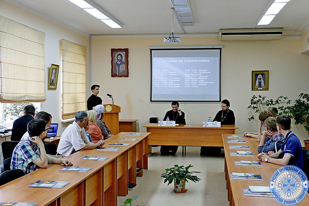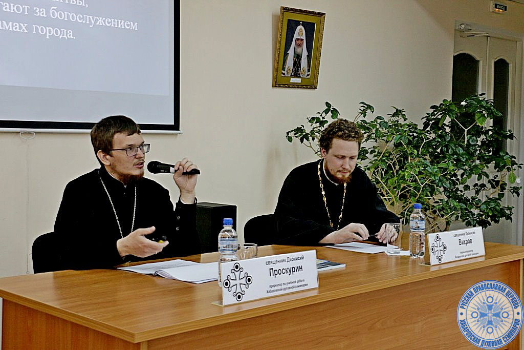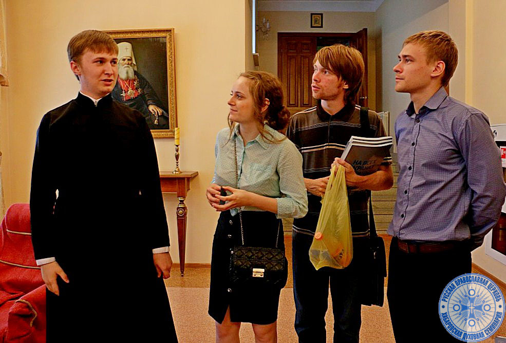 В 10:20 – в читальном зале семинарии прошла встреча гостей с иереем Дионисием Проскуриным – проректором по учебной работе, и первым проректором – иереем Дионисием Вихровым, которые провели краткую беседу для гостей, рассказав об учебном процессе, быте и ежедневных трудах студентов.