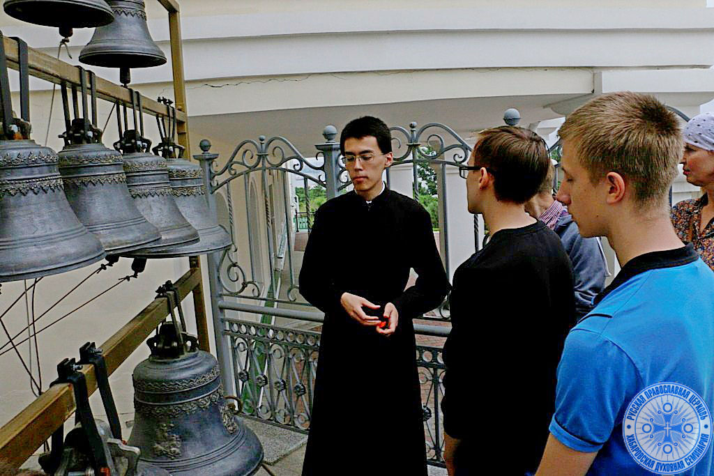 В завершении насыщенной программы дня, подготовленной администрацией духовной школы, всем желающим было предложено попробовать ощутить себя на несколько мгновений настоящими звонарями, теми людьми которые, как говорили в древности «зазывали» на службу богомольцев. Мастер-класс по интересному виду церковного музыкального искусства провел студент 3 курса духовной школы – чтец Константин Маркин.