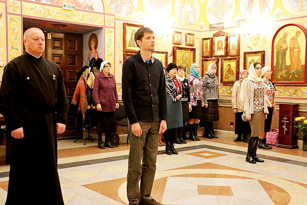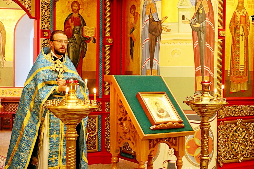 В конце службы духовенство пропели славление перед иконой праздника Покрова Пресвятой Богородицы, после чего отец Николай (Дроздов) обратился к молящимся с проповедью.