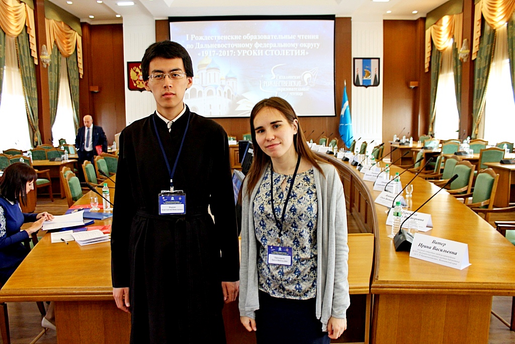В Дальневосточном этапе чтений приняли участие представители нескольких регионов – Приморского края, Амурской области и др. Хабаровский край представляли преподаватель духовной семинарии Проскурина Арина Николаевна и студент духовной школы Маркин Константин.