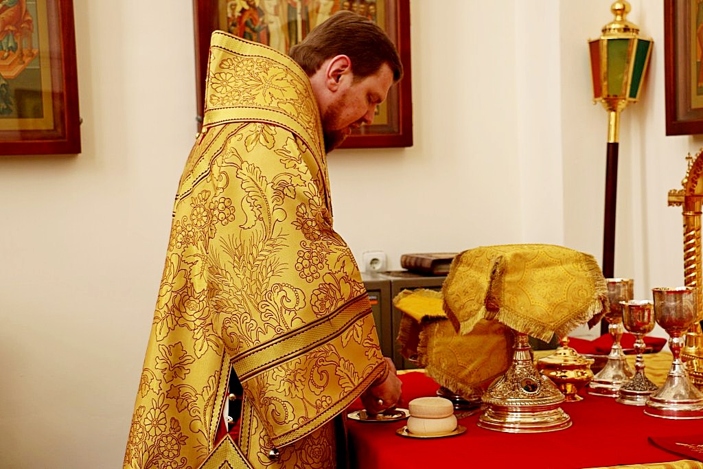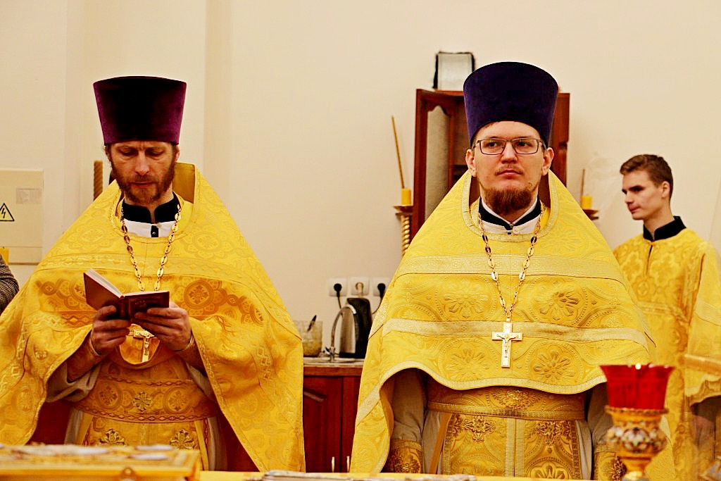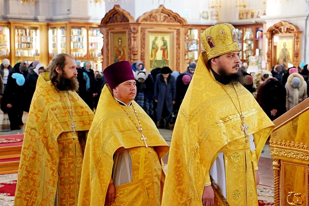 Его Высокопреосвященству за богослужением сослужили: протоиерей Георгий Сивков, настоятель собора; протоиерей Константин Чунчук; иерей Дионисий Проскурин, первый проректор духовной семинарии, а также духовенство собора.