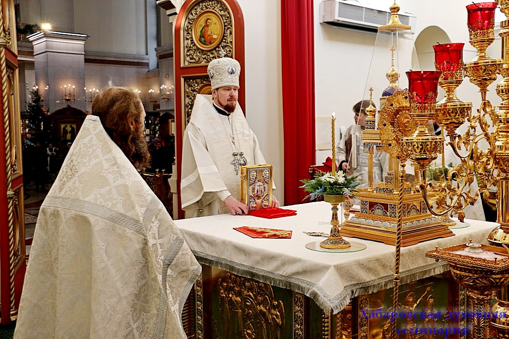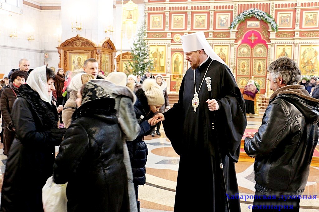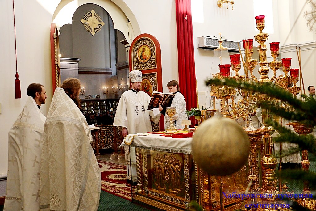 После окончания Царских часов и изобразительных, митрополит Хабаровский и Приамурский Владимир совершил вечерню праздника Рождества Христова в соединении с Божественной Литургией святителя Василия Великого.