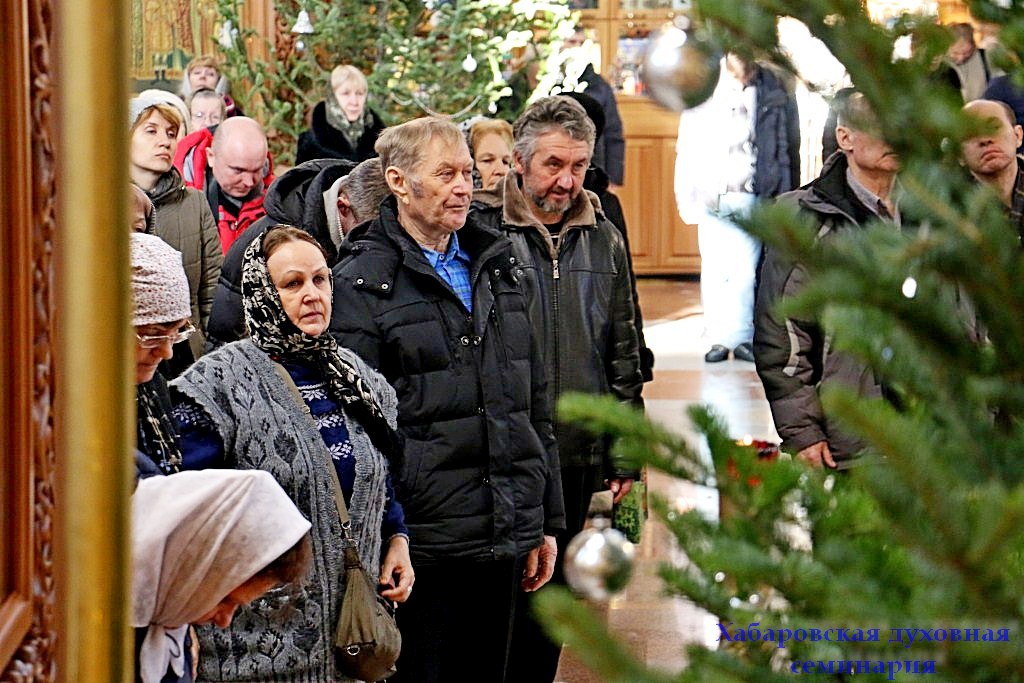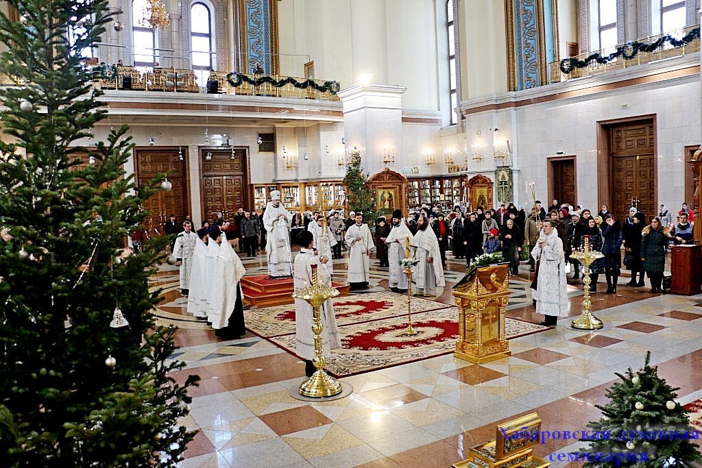 В Рождественский сочельник в Спасо-Преображенском Соборе г. Хабаровска состоялось последование Царских часов, которое включает чтение 1-го, 3-го, 6-го и 9-го часа с особыми псалмами, пением тропарей, паремиями, чтением Евангелия и Апостола.