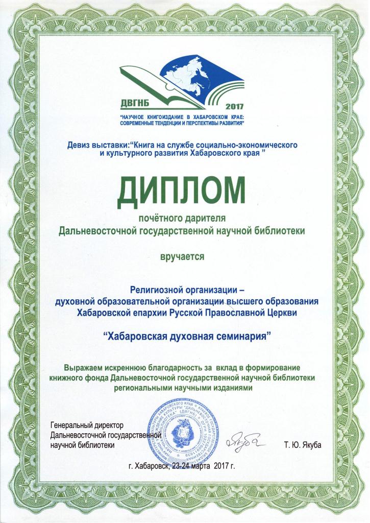 Среди них были представлены издания, посвященные Году экологии в России, выставка документов из фонда Государственного архива Хабаровского края, приуроченная к 85 – летнему юбилею г. Комсомольска-на-Амуре, экспозиция из книг дальневосточных авторов, проиллюстрированная Народным художником России Г.Д. Павлишиным. По завершении работы книжной выставки состоялось награждение Хабаровской духовной семинарии как почётного дарителя Дальневосточной государственной научной библиотеки. Диплом от лица семинарии получил директор библиотеки Кузнецов Максим Юрьевич.