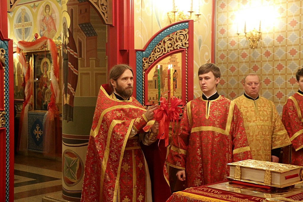После пения хвалитных стихир и стихир Пасхи «Да воскреснет Бог» священник Олег Кузнецов торжественно прочитал Огласительное слово свт. Иоанна Златоуста.