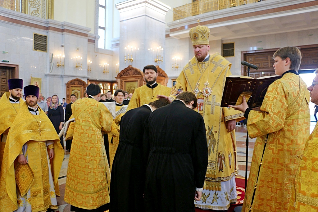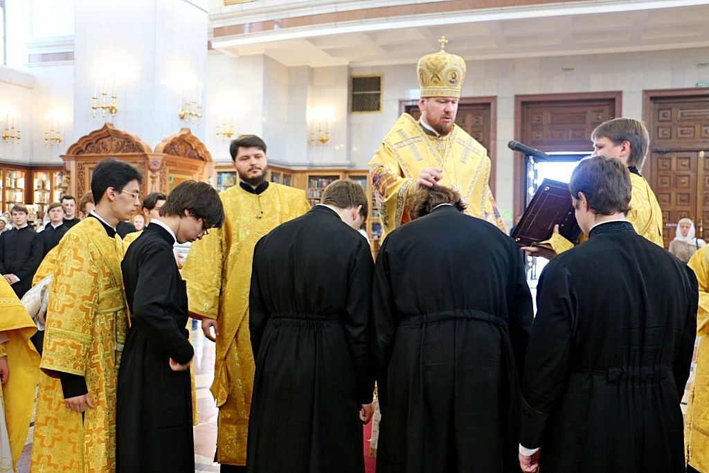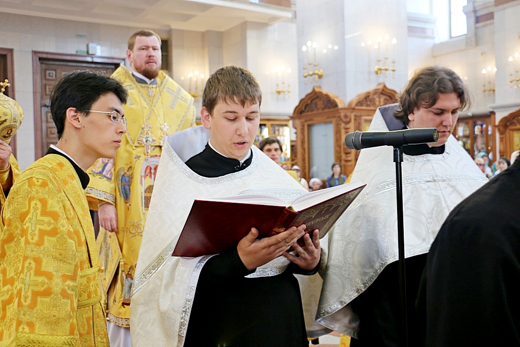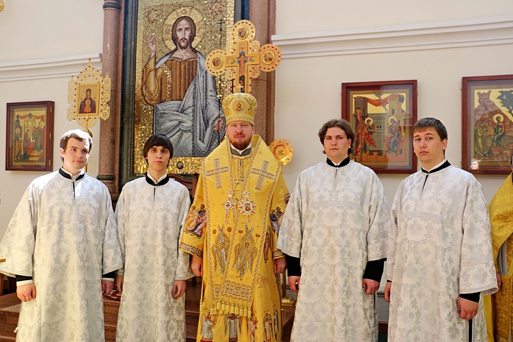 Перед началом Божественной литургии, митрополит Владимир совершил поставление во чтецов выпускников 2016/2017 года Хабаровской духовной семинарии: Александра Емельянова, Прохора Огородникова, Владислава Савчина и Николая Трофимова.