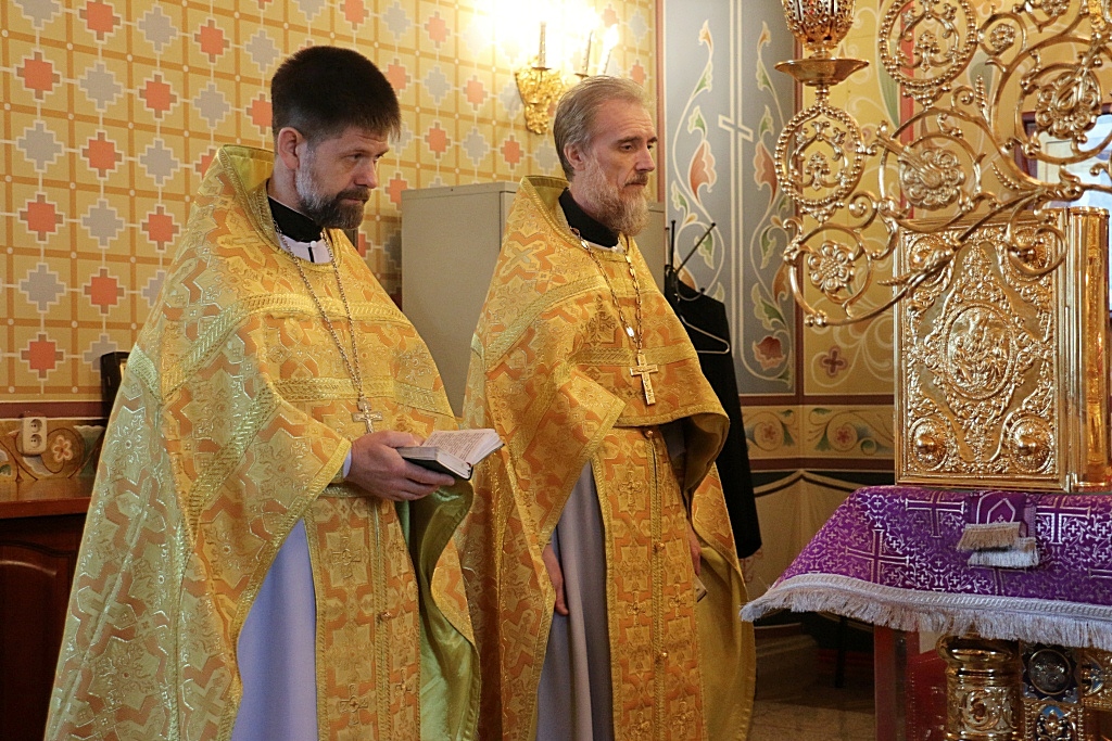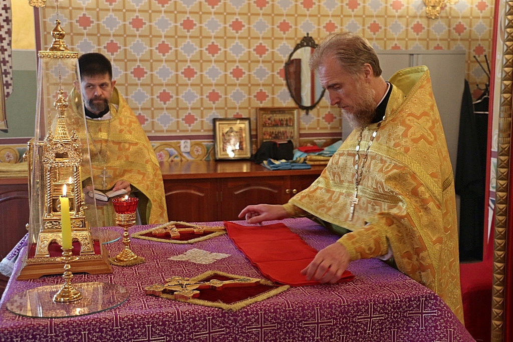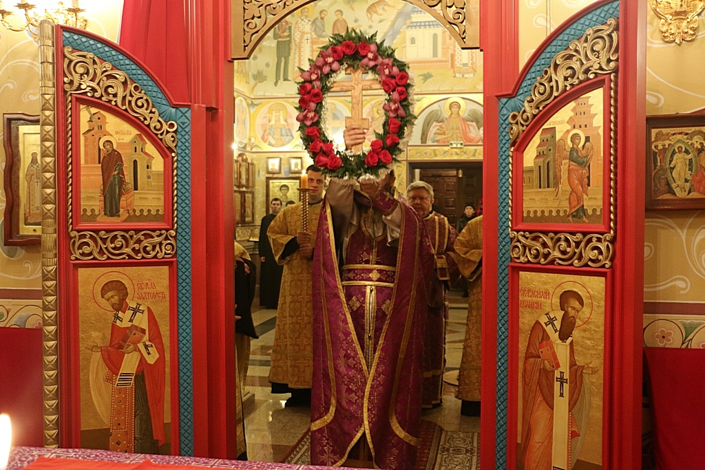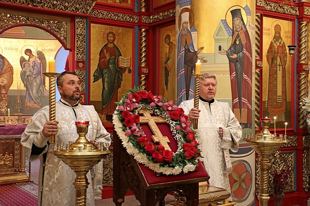 После причастия отец Олег весте с сослужащим ему духовенством в центре храма совершил славление празднику, пропев тропарь и кондак Кресту Господню.