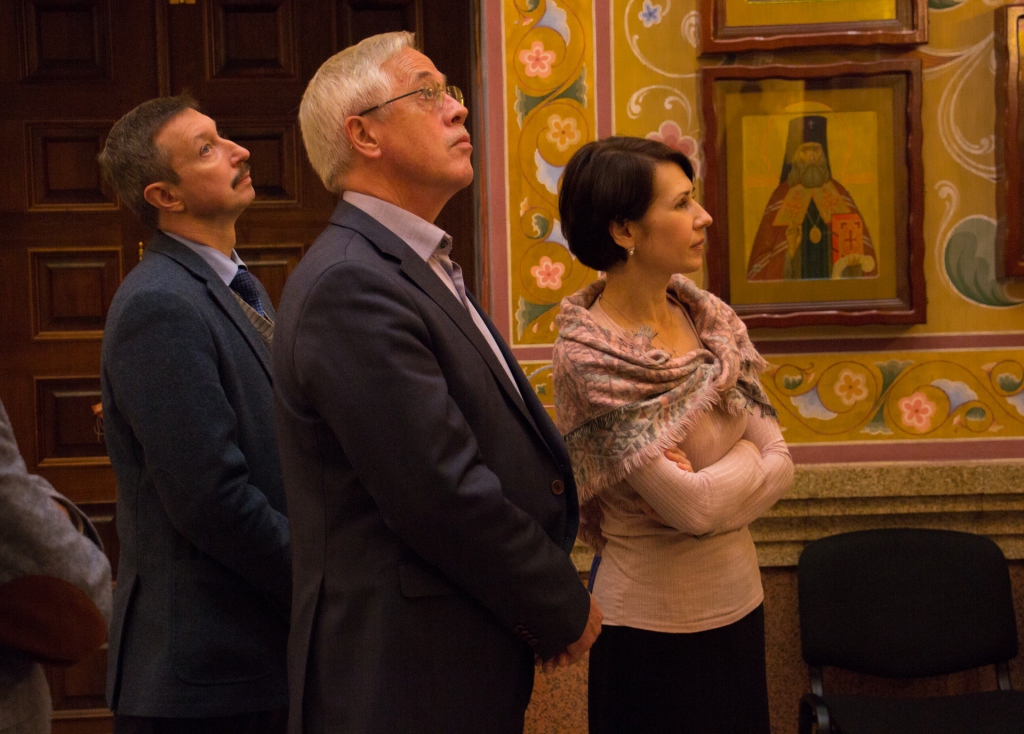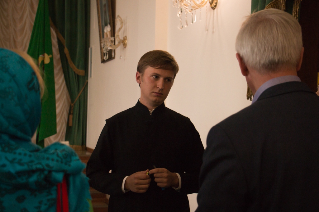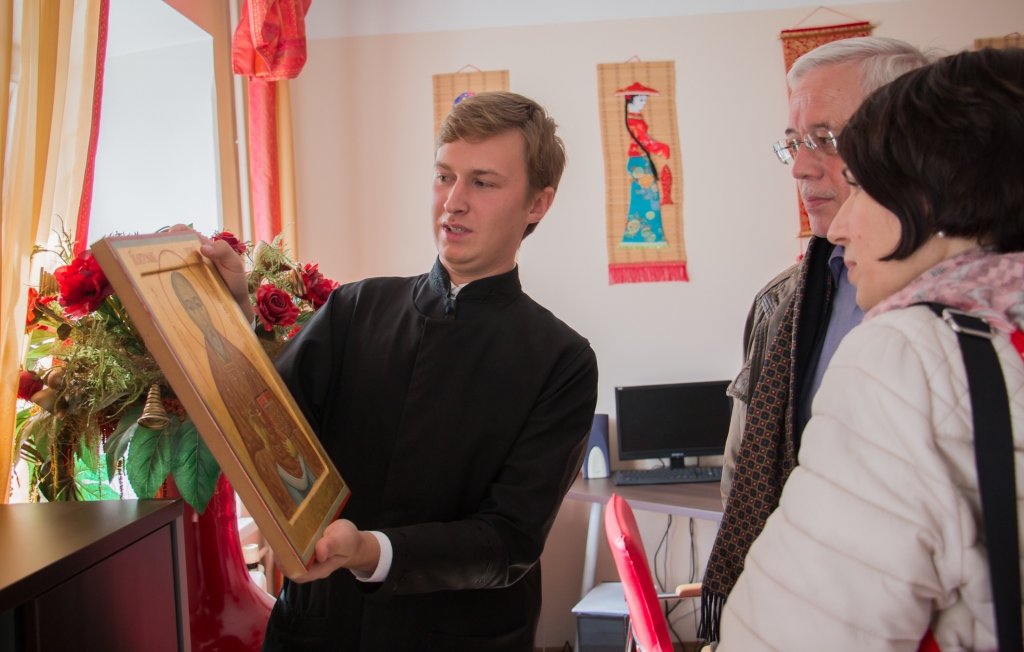 Экскурсию по семинарии провел студент 3-го курса Александр Пискун. Началось посещение с домового храма, где Александр рассказал гостям о небесном покровителе духовной школы— святителе Иннокентии Московском, который совершил много трудов, для распространения Православия на Дальневосточной земле.
