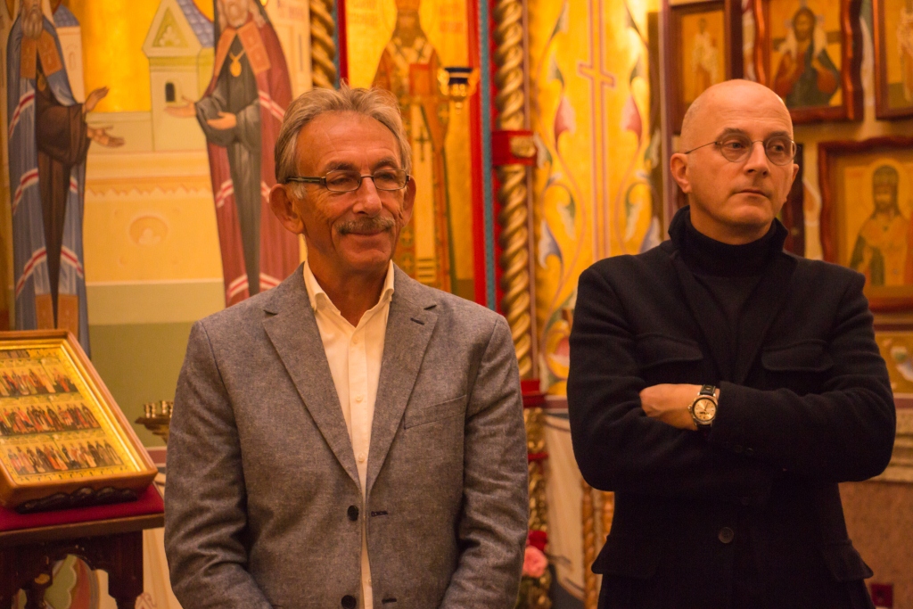 Экскурсовод Александр рассказал делегации из Германии и о том, что в духовной школе ведется работа с иностранными студентами из стран Восточной Азии, показав гостям иконы с изображениями китайских святых.