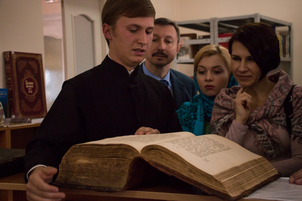 В библиотеке гостям семинарии были представлены древние богослужебные книги XVIII и XIX вв, а в читальном зале внимание экскурсантов было остановлено на портретах патриархов Русской Православной Церкви, среди которых есть иерархи прославленные в лике святых.