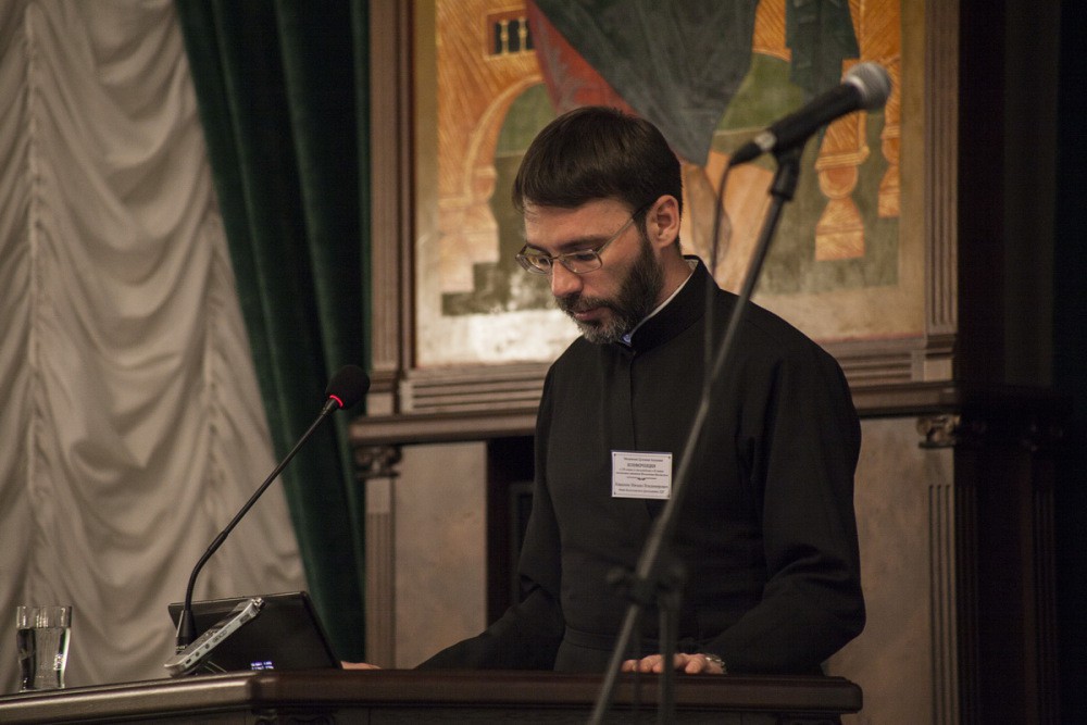 На открытии форума секретарь Ученого совета МДА, доцент игумен Адриан (Пашин) зачитал приветственное слово председателя Учебного комитета Русской Православной Церкви, ректора МДА архиепископа Верейского Евгения.