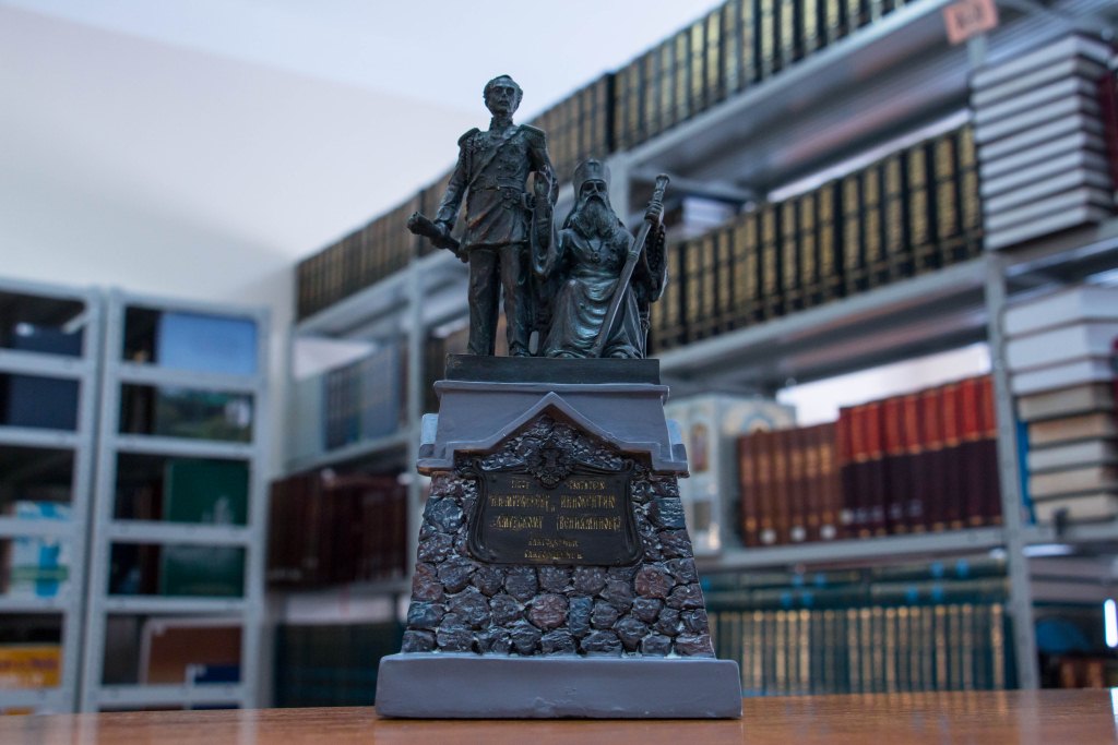 Статуэтка-копия памятника графу Н.Н. Муравьеву-Амурскому и cвятителю Иннокентию Московскому в библиотеке духовной семинарии
