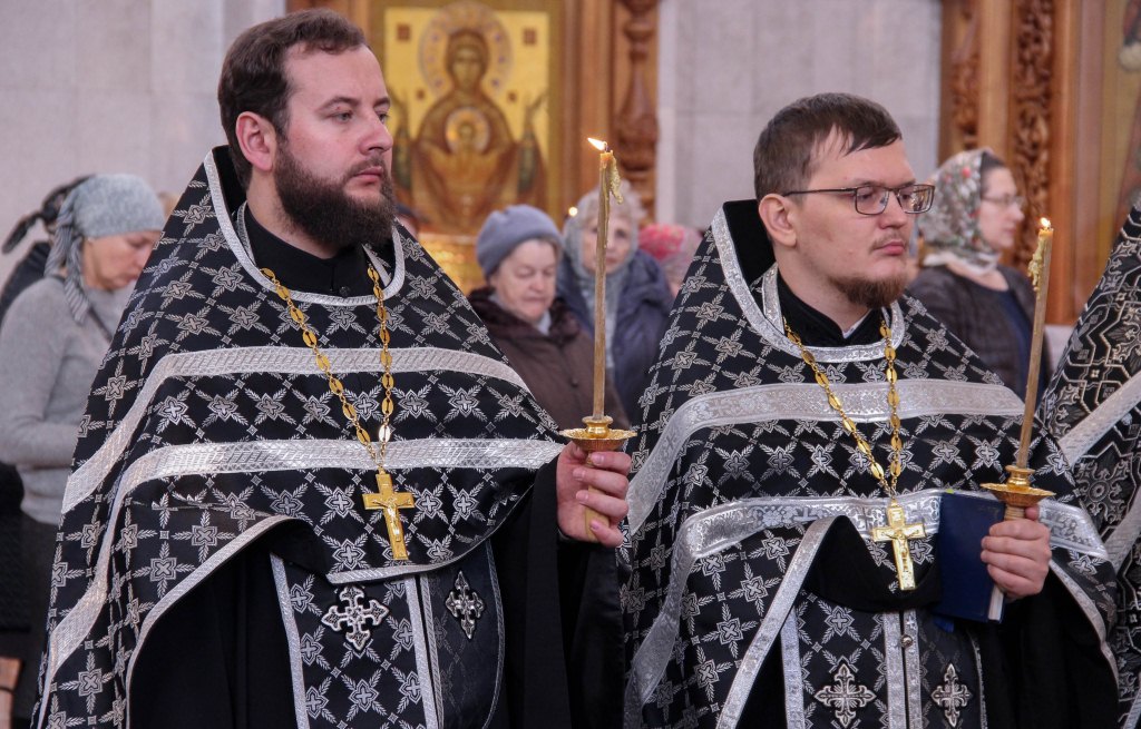 Его Высокопреосвященству сослужили: протоиерей Георгий Сивков ключарь собора; иерей Дионисий Проскурин, первый проректор духовной семинарии; иерей Максим Суворов, проректор по науке и инновациям; иерей Олег Кузнецов, благочинный семинарского храма и духовенство собора.