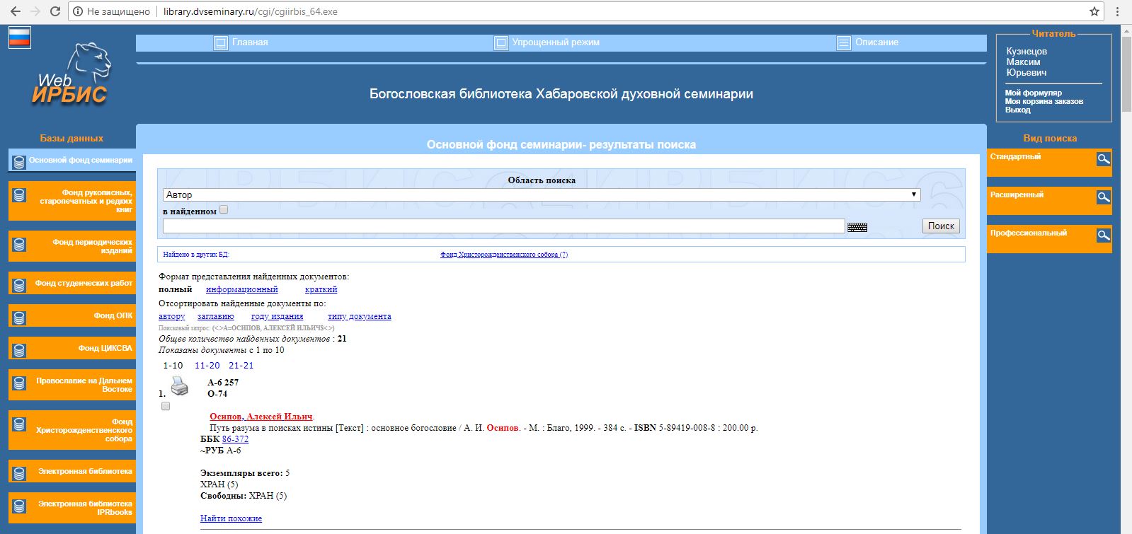 Электронный библиотечный каталог «Web ИРБИС» является составной частью и центральным звеном библиотечно-информационной системы Богословской библиотеки – первенствующей на Дальнем Востоке духовной школы – Хабаровской духовной семинарии.