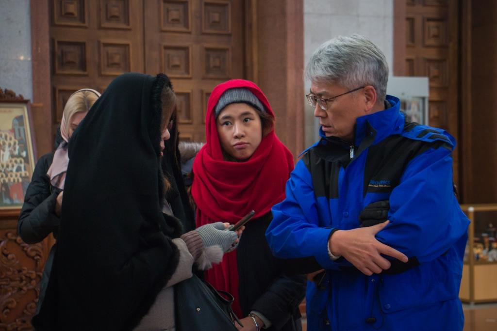 Затем гости направились в Хабаровскую духовную семинарию. Начали они с главного места духовной школы – домового храма. Здесь они познакомились с житием святителя Иннокентия Московского. Для корейцев было очень интересно узнать, что у сотрудничества Церкви и государства очень богатые плоды. Для примера им было представлено сотрудничество святителя Иннокентия и графа Николая Николаевича Муравьёва-Амурского.