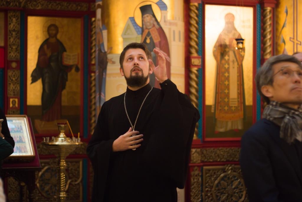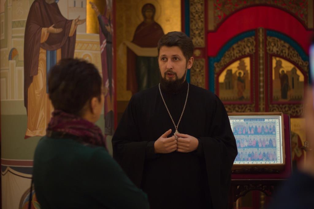 Здесь отец Николай рассказал об устройстве православных храмов и особое внимание обратил на принадлежащей Преображенскому Собору икону Божией Матери «Хабаровская». На ее примере было показано значение икон в православной традиции. Помимо икон, экскурсовод показал делегации частицы нетленных мощей православных святых и рассказал об их почитании.