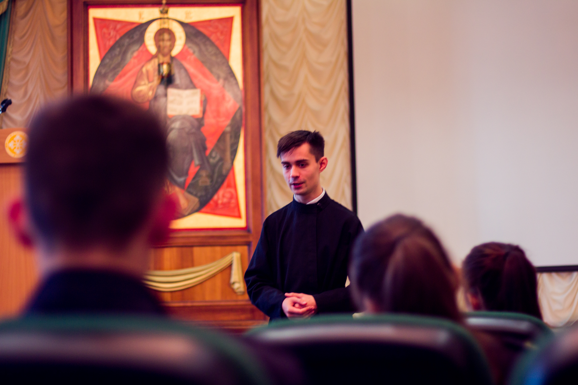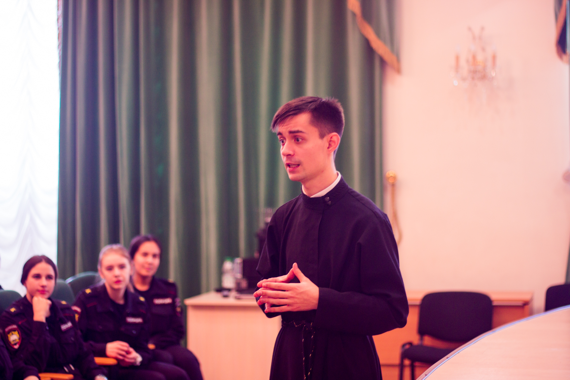 В актовом зале духовной школы, гости смогли задать интересующие их вопросы. Курсанты отметили, что жизнь и учёба семинаристов очень схожа с уставом их института.