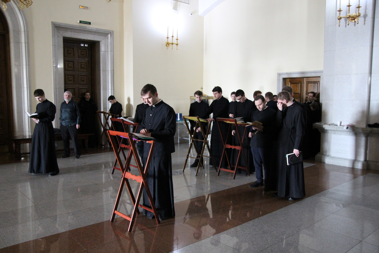 Богослужебные песнопения исполнили студенты семинарии, состоявшие в мужском хоре духовной школы под руководством регента Бородиной Яны Александровны.